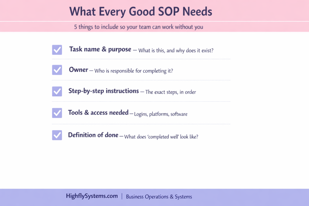 Not a 40-page manual. In fact, it doesn’t need to be formal at all. It can be a short checklist, a quick Loom video, or a step-by-step note inside ClickUp. However, what it needs to cover is straightforward: